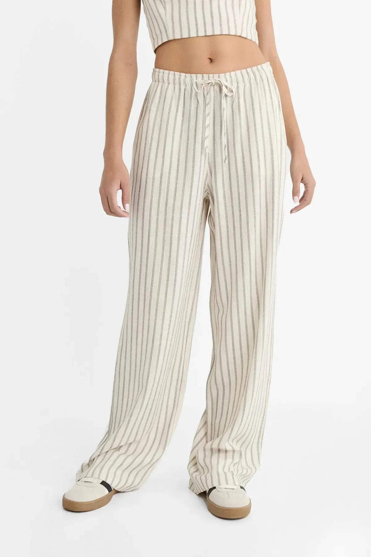 Kadın Bej Armür Detaylı Bol Paça Bağcıklı Keten Pantolon