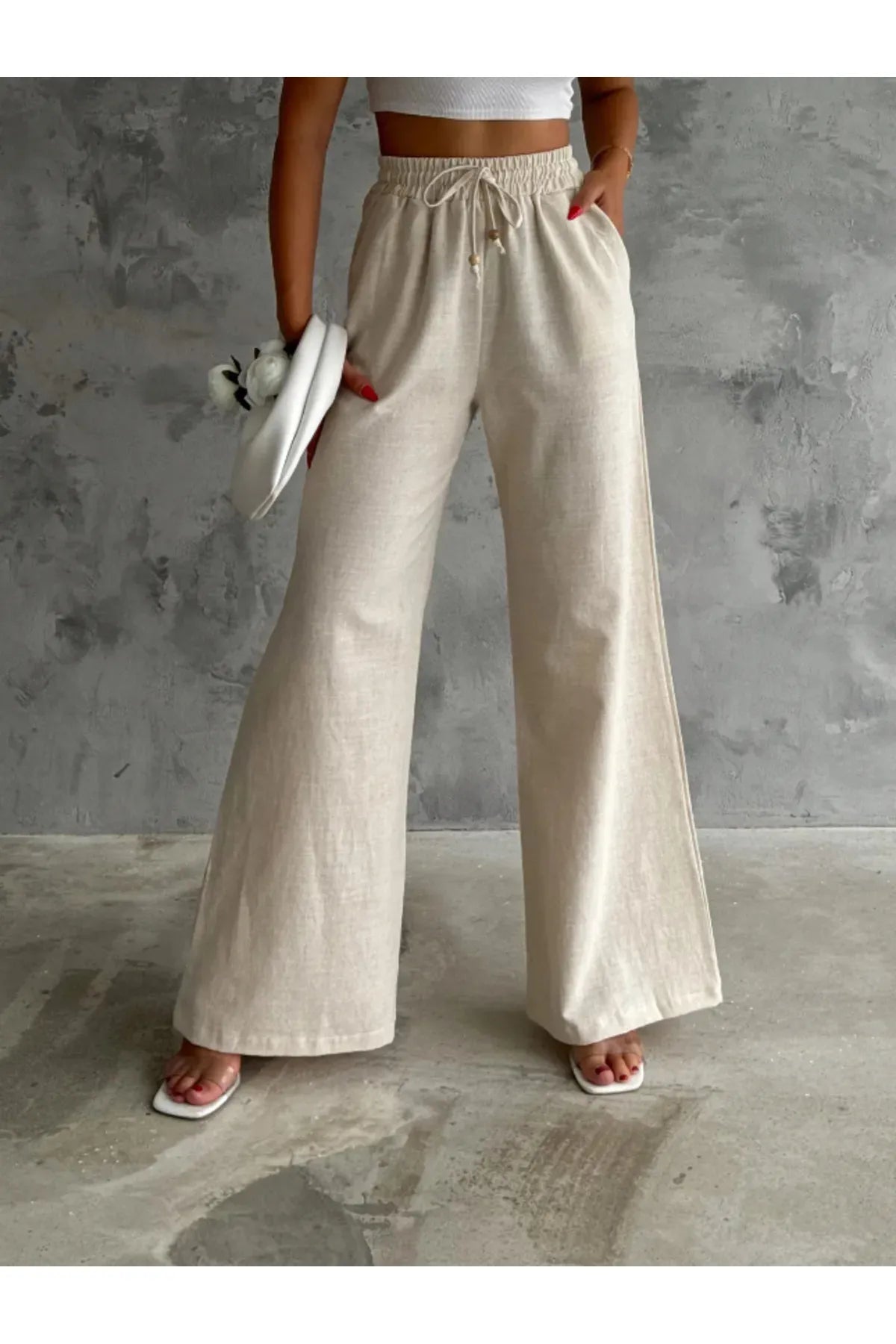 Kadın Bol Paça Bağcıklı Keten Pantolon