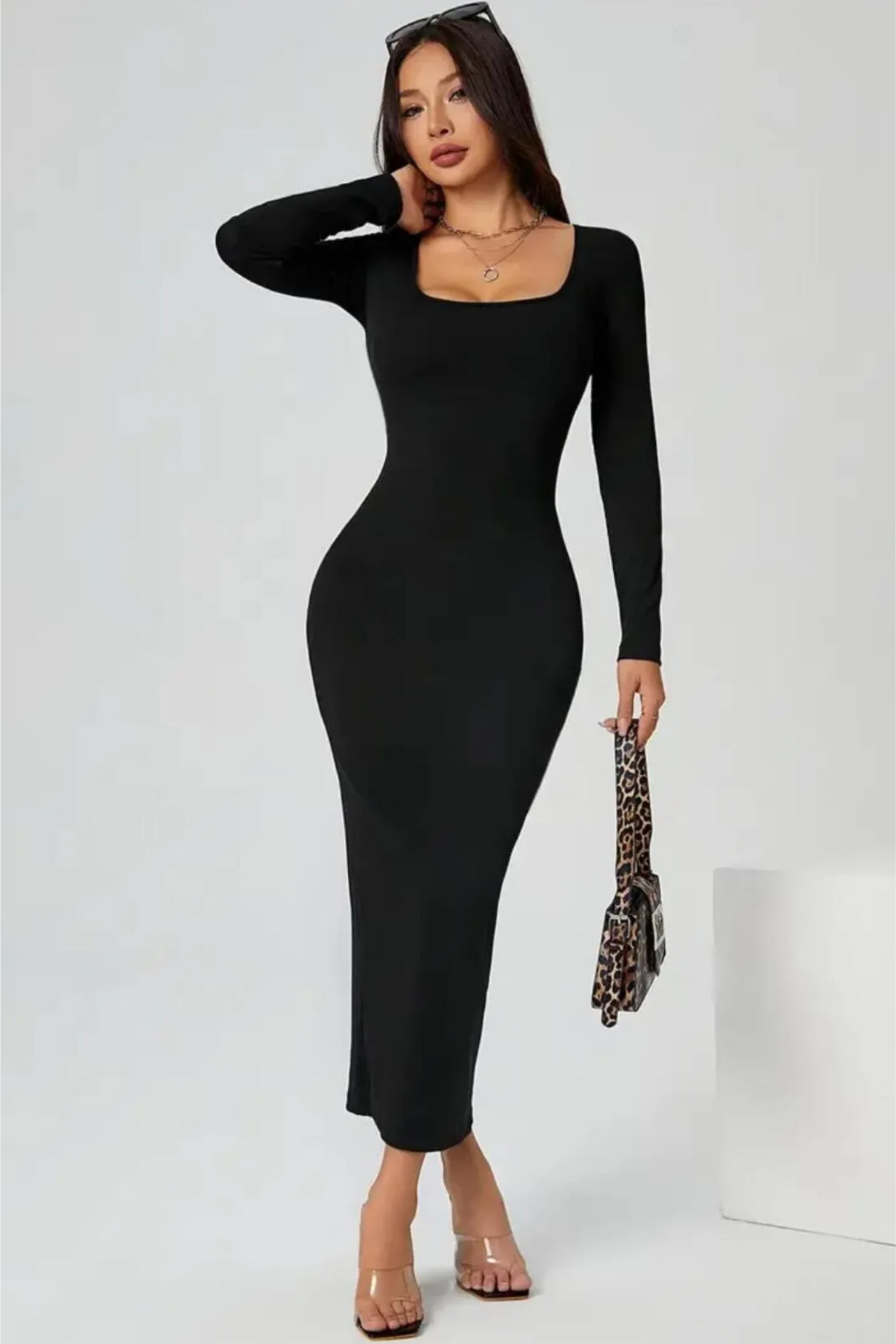 Kare Yaka Uzun Kollu Likralı Uzun Elbise